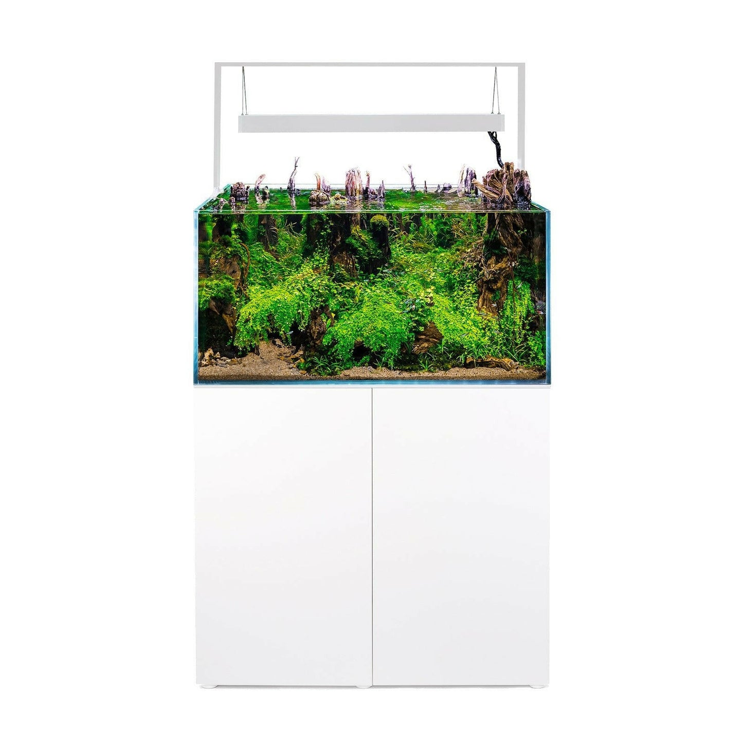 The aquarium boasts transparent silicone seals, shear joints, polished and ground edges, and precise glass joining, ensuring a refined, premium-class finish. Included is an elegant, height-adjustable lamp equipped with replaceable Leddy Tube lighting modules, allowing for easy maintenance and customization of lighting to suit plant and aquatic life needs. The lamp’s aesthetic frame and integrated cable wrapper contribute to a clean, sophisticated appearance, while the set also includes a protective aquarium mat to safeguard surfaces.