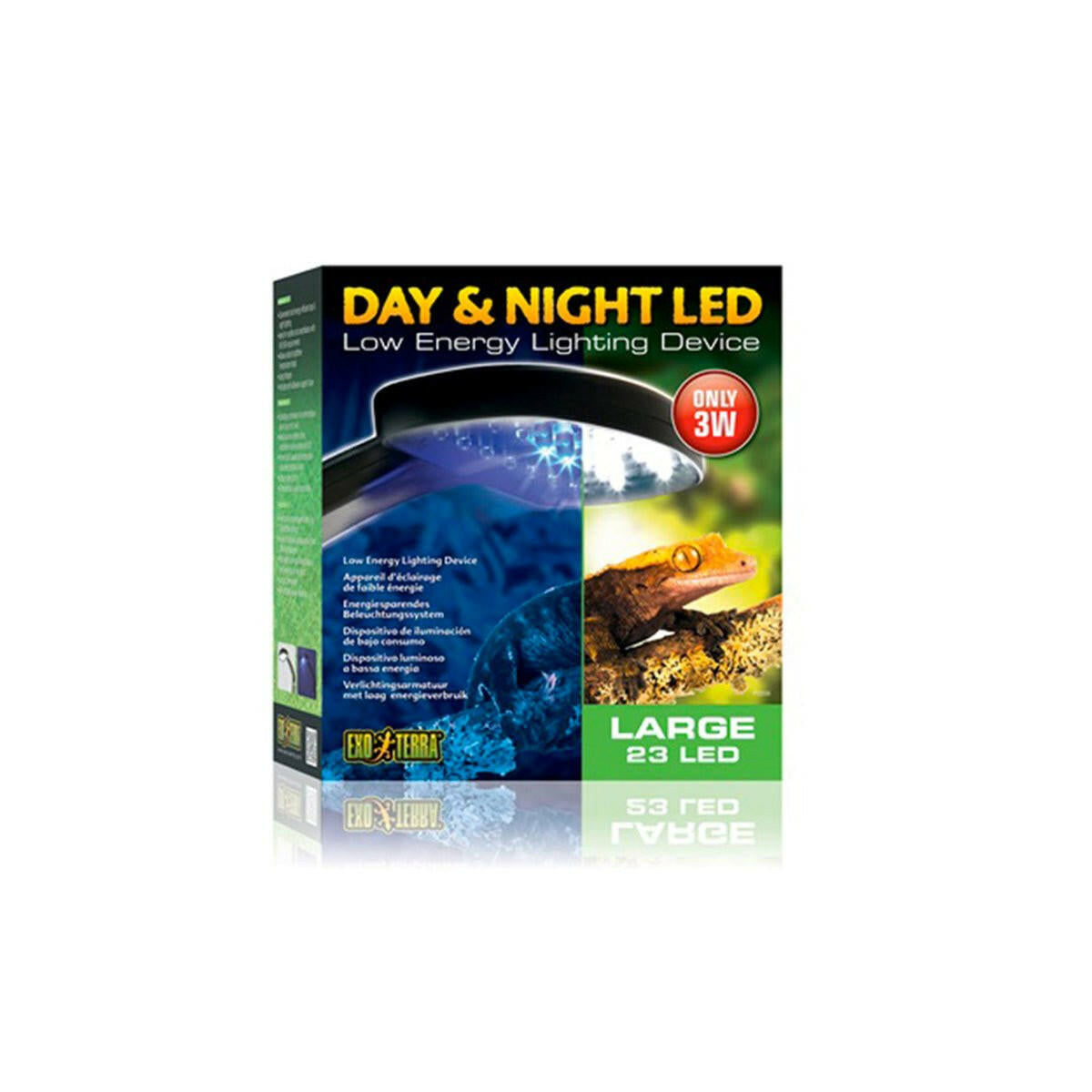 The Exo Terra Day & Night LED is ideal for reptiles, amphibians and invertebrates with NO UVB-requirements, like snakes, nocturnal geckos, frogs, newts, salamanders, spiders, scorpions, insects, etc.