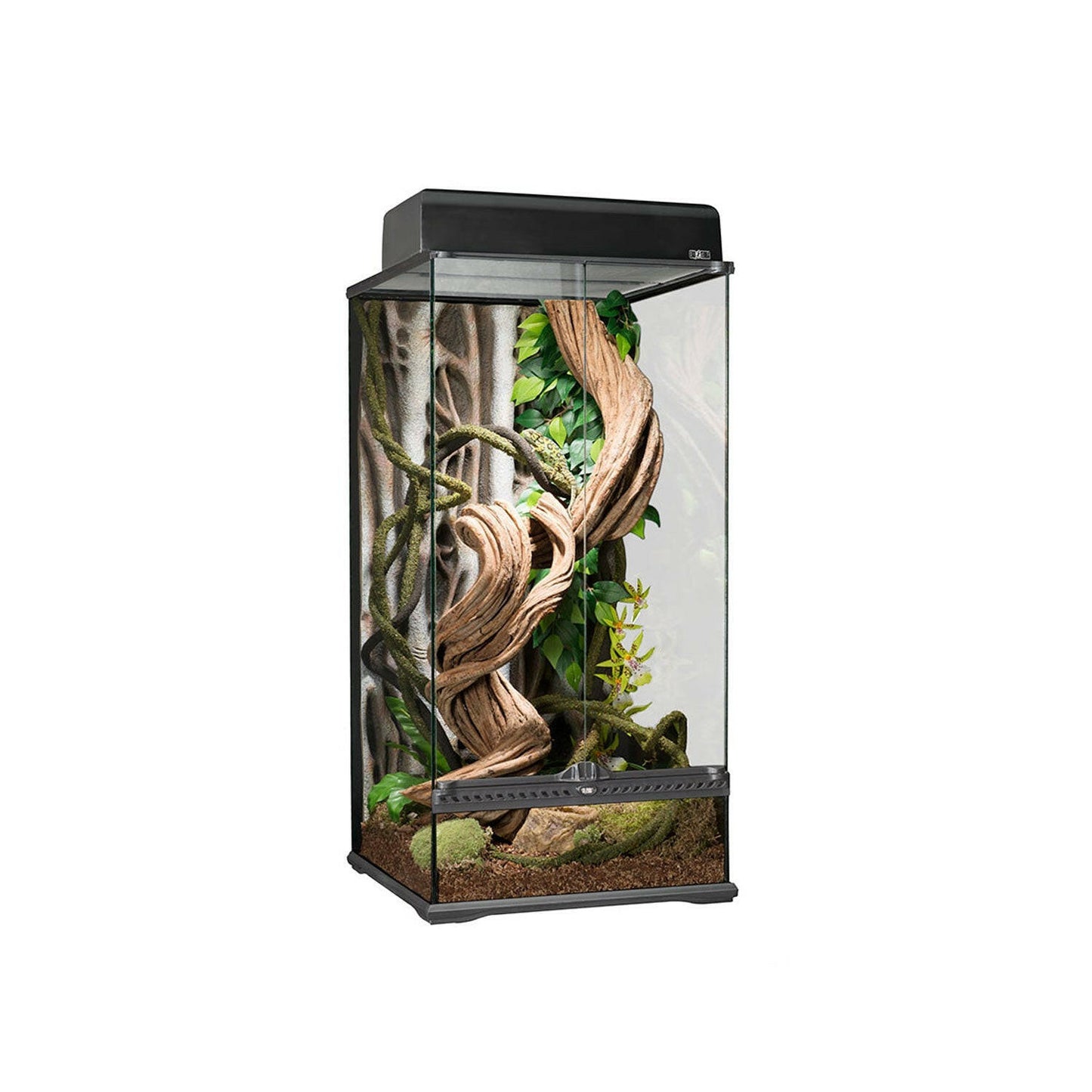 The front opening doors allow easy access for maintenance and feeding. A specially designed lock will prevent escape and the doors can be opened separately. The full screen top ventilation allows UVB and infrared penetration, and is completely removable for easy access while decorating or cleaning. In the back of the screen cover are 5 closable wire or tube inlets on both sides to install Heat Wave Rocks, Waterfalls, sensors, etc. inside the terrarium.