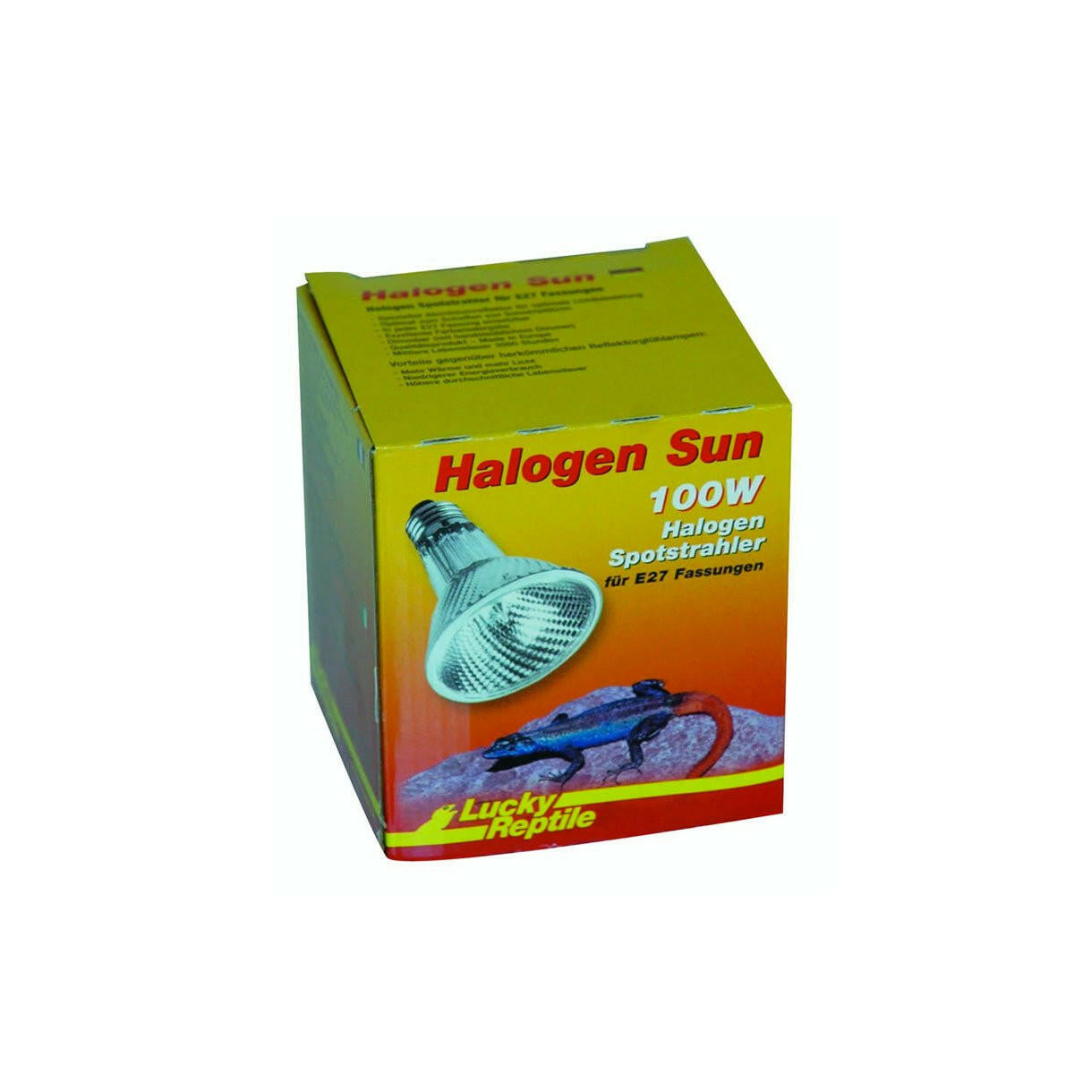The Lucky Reptile Halogen Sun spot lamp brings more light and heat on the spot and does lead to a lesser increase of the ambient air temperature than regular reptile spot lamps with the same wattage. As result it is easier to set up the proper heat gradients in the terrarium and greater distances between animal and the spot lamp can be realized. Further advantages are the higher average life, the higher resistance against spray water and the 15% lower power consumption compared to incandescent spot lamps with the same wattage.