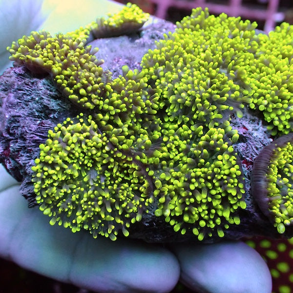 This mushroom rock is around 8cm.  Rhodactis mushrooms prefer moderate/lowlighting and moderate flow.     Read More